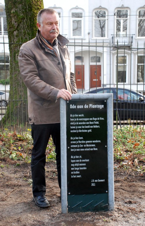 Plaquette met een gedicht van Ko van Geemert (1950) en twee zitbanken met de namen van bekende personen die verbonden zijn met de Amsterdamse Plantagebuurt.