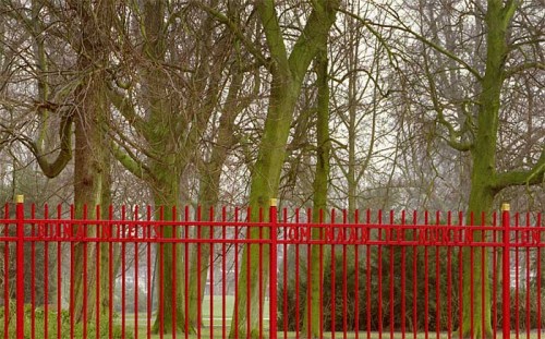 Vogel wipt/ Tak kraakt/ Lucht betrekt/ Bijna niets/ om naar te kijken/ en juist dat/ bekijk ik (Roland Jooris: Minimal. Uit: Het museum van de Zomer, 1974) Typografie op hekwerk, rechts van entree J.F. Kennedylaan. In opdracht van gemeente Breda, supervisie door Post-St.Joost, Breda.