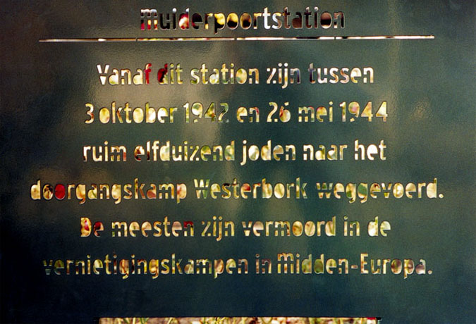 Vanaf dit station zijn tussen 3 oktober 1942 en 26 mei 1944 ruim elfduizend joden naar Westerbork weggevoerd. Ontwerp herinneringsplaquette en stadsbank met gedicht van Victor E. van Vriesland.