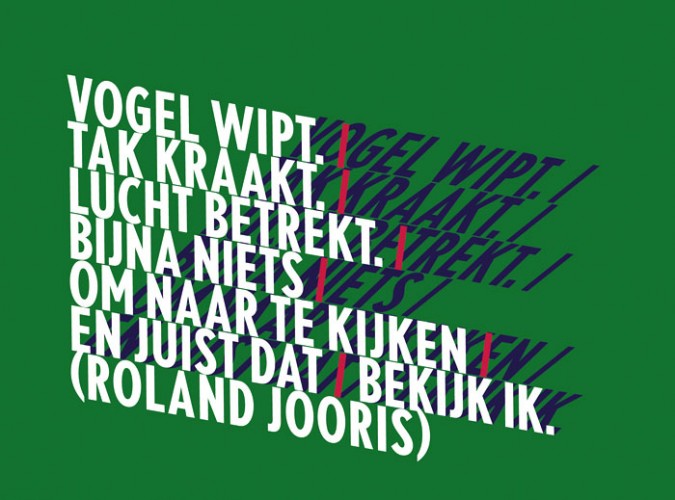 Vogel wipt/ Tak kraakt/ Lucht betrekt/ Bijna niets/ om naar te kijken/ en juist dat/ bekijk ik (Roland Jooris: Minimal. Uit: Het museum van de Zomer, 1974) Typografie op hekwerk, rechts van entree J.F. Kennedylaan. In opdracht van gemeente Breda, supervisie door Post-St.Joost, Breda.
