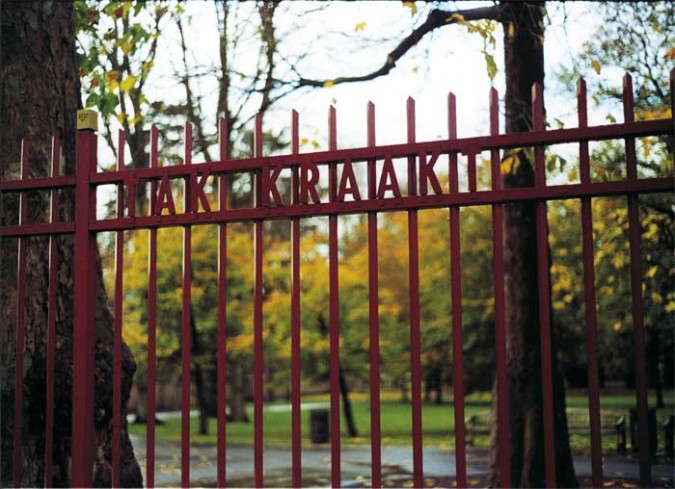 Vogel wipt/ Tak kraakt/ Lucht betrekt/ Bijna niets/ om naar te kijken/ en juist dat/ bekijk ik (Roland Jooris: Minimal. Uit: Het museum van de Zomer, 1974) Typografie op hekwerk, rechts van entree J.F. Kennedylaan. In opdracht van gemeente Breda, supervisie door Post-St.Joost, Breda.